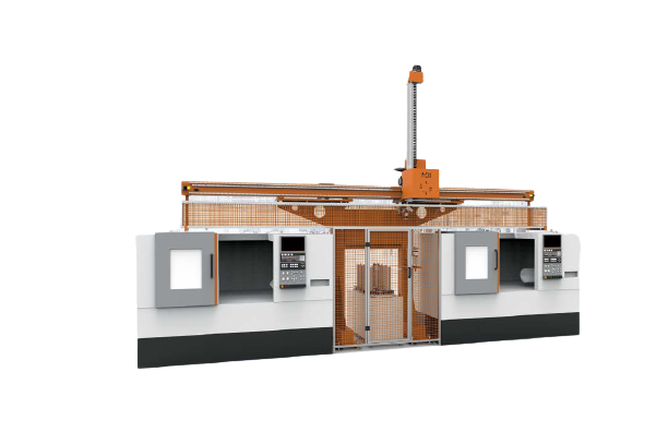 CJB 系列桁架機器人屬于外置式一拖二的布局方式。它可以完成兩臺機床的自動上下料,特別適合加工節拍短、生產批量大、一序或者兩序加工的產品。